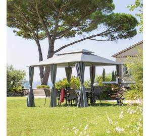 גזיבו לגינה מובנה במתכת צבוע בצבע אפוקסי למנוע מחלודה. הגזיבו מגיע עם בד לגגון מפוליאסטר בצפיפות 200 ג/מ2 ועוד 6 ווילונות המקיפים את כל השטחהווילונות עשויים מבד פוליאסטר בצפיפות 160 g/m2 בצבע אפוראפשר להוריד את הבדים מהגזיבו כדי לכבס אותםבעל ערובת אוורור בחלקו העליון של החופה, ה..