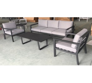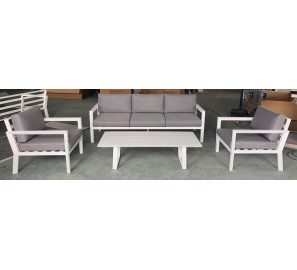 סלון אלומיניום לחוץ בעל מבנה העשוי כולו מאלומיניום מולחם ללא הברגות וללא צורך בהרכבההסט כולל ספה תלת + 2 כורסאות יחיד + שולחן קפהמגיע יחד עם כריות גב המעניקים ישיבה ישיבה נוחה לאורך זמן ואותם ניתן לכבס לאחר הוצאת המילוי שלהן דרך הרוכסן המיועד לכךקיים בצבע - מבנה לבן עם כריות אפור | מבנה אפ..