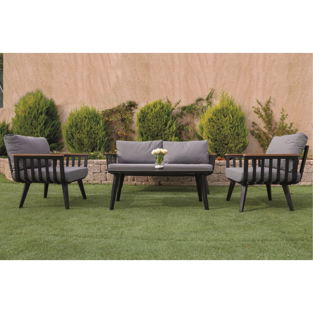 בין הדגמים האיכותיים ומבוקשים בשוק הסט כולל ספה דו מושבית, שני כורסאות יחיד ושולחן קפה 100% אלומיניום