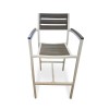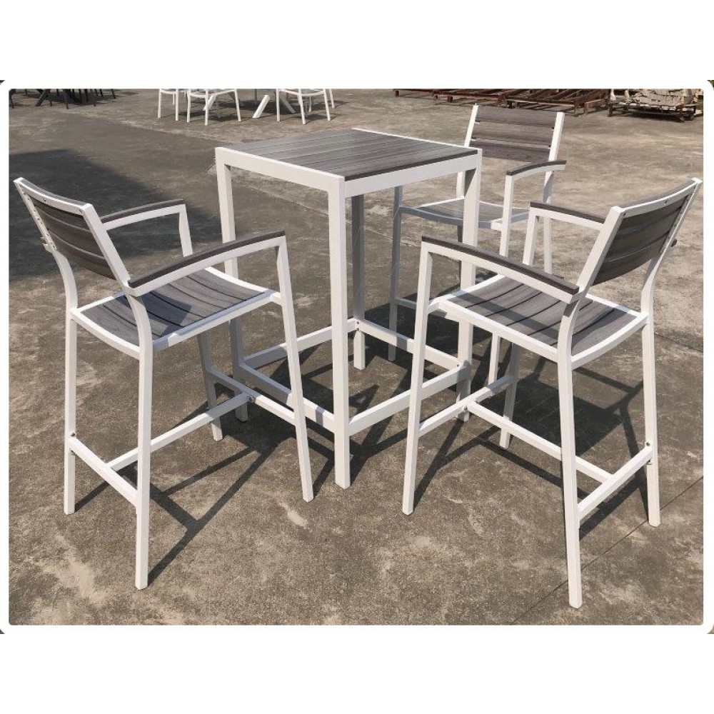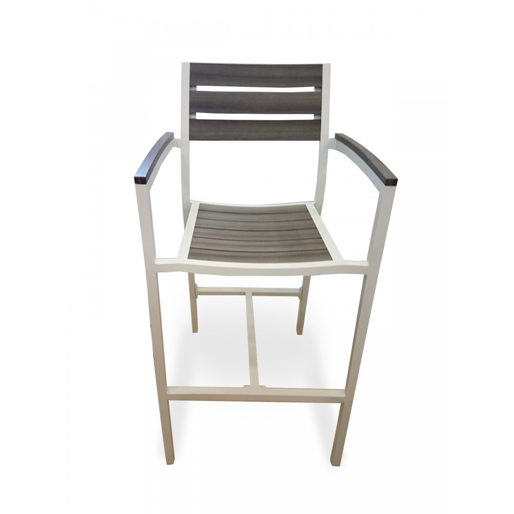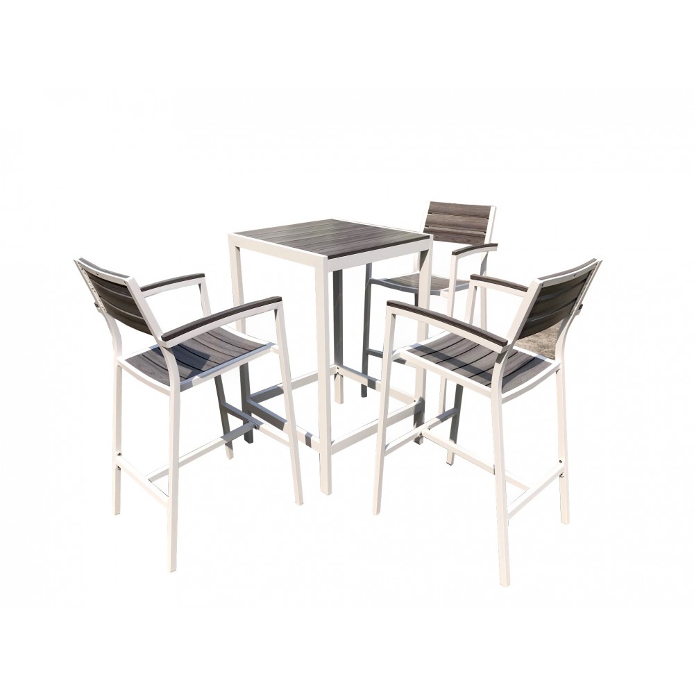 השולחן מגיע עם פלטת אלומיניום דמוי עץ, רגליים יציבות ומחוזקות ו- 4 כיסאות בר גבוהים ומרשימים עשויים מסגרת אלומיניום איכותי לבן משולב אלומיניום דמוי עץ.