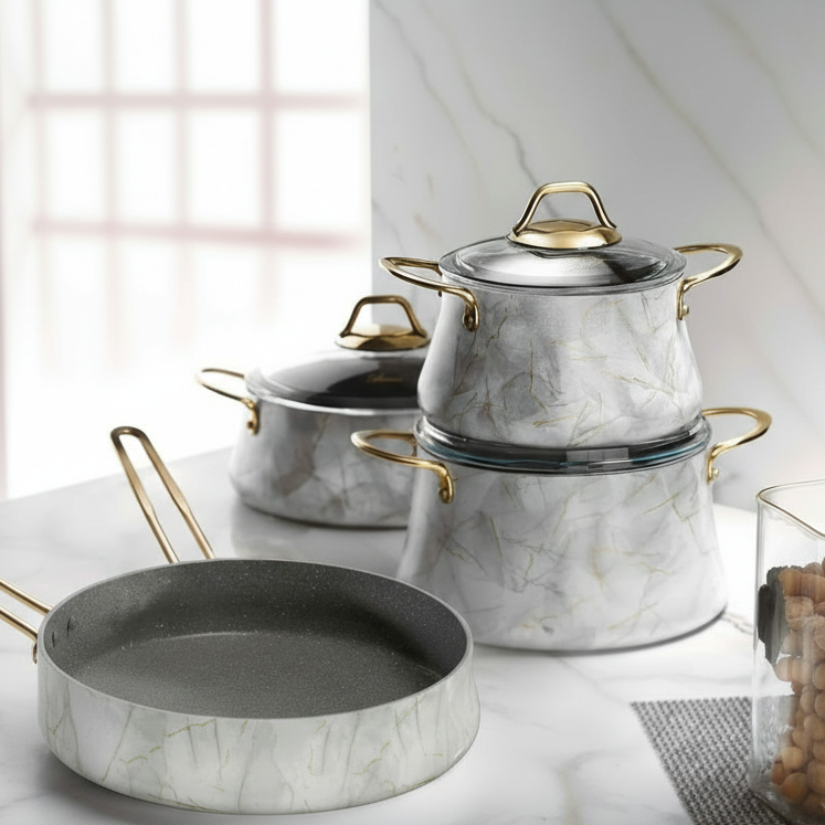 סט סירים 7 חלקים עשוי מיציקת אלומיניום בציפוי שיש אפור