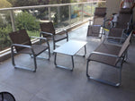 סלון העשוי מאלומיניום בצבע כסף עם מושבים ומשענות גב מבד טקסטילן לבן. הסט כולל ספה זוגית, שני כורסאות יחיד ושולחן.
