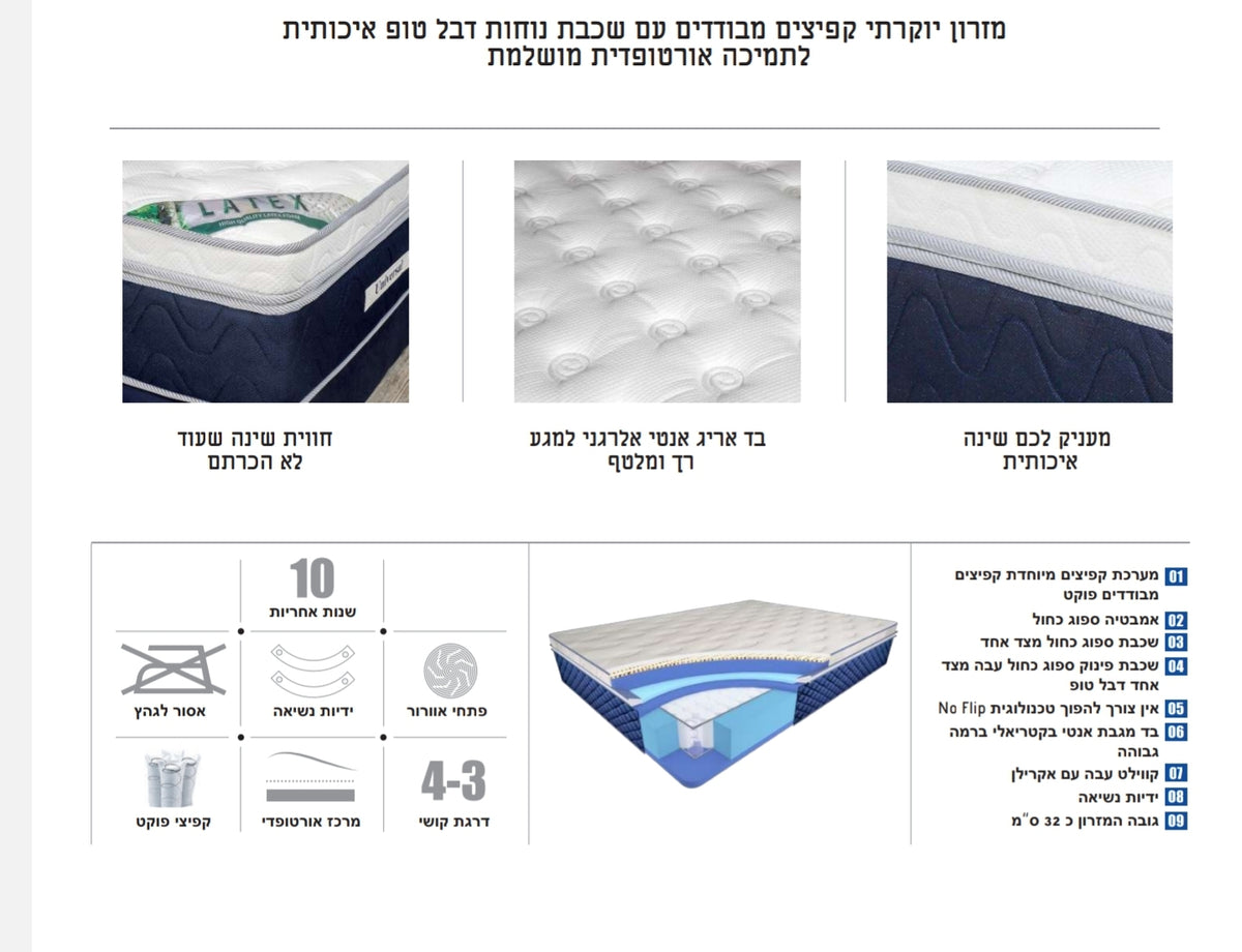 מזרון יוקרתי קפיצים מבודדים עם שכבת נוחות דבל טופ איכותית לתמיכה אורטופדית מושלמת, מעניק לכם שינה איכותית