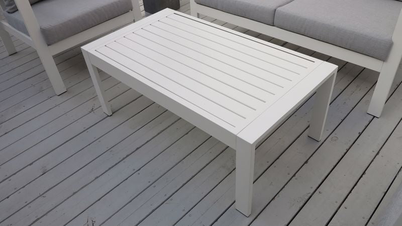 המערכת כוללת ספה זוגית, שני כורסאות יחיד ושולחן קפה 100% אלומיניום, ללא פלטה מזכוכית.