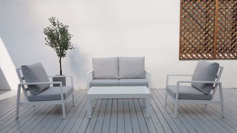 סלון לגינות ולמרפסות העשוי מאלומיניום עם כריות גב ומושב מפנקות.