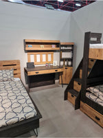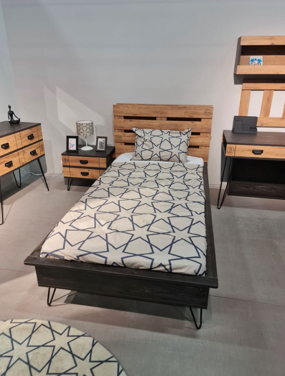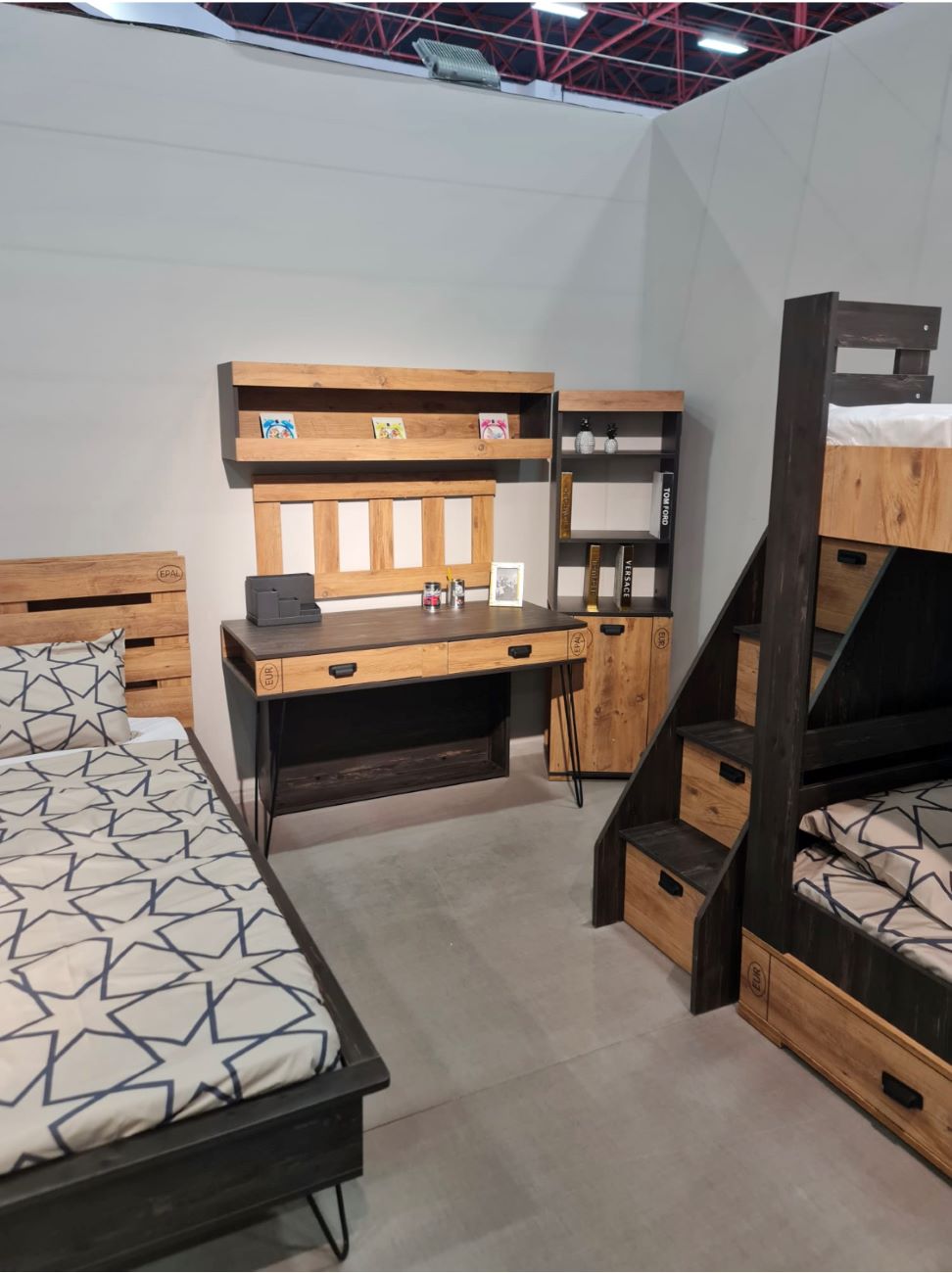 הכולל מיטה עם מזרון ספריה עם שולחן כתיבה וארון יחיד צדדי + מיטת קומתיים עם מגירות אחסנה למצעים