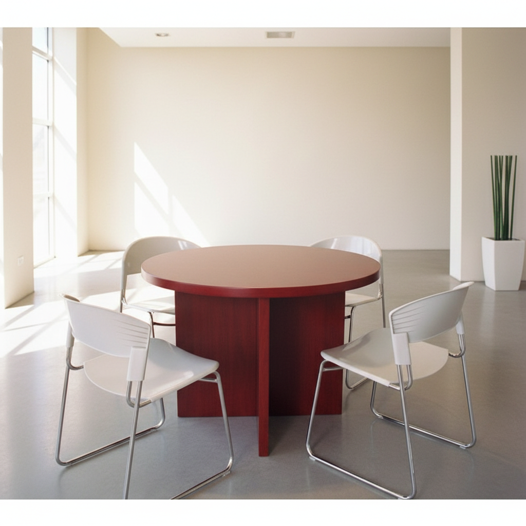 שולחן ישיבות מעוגל, עשוי MDF מצופה דמוי פורניר. שולחן ישיבות במראה קלאסי ומהודר, פרקטי לחללים קטנים. מידות: קוטר 105 ס"מ גובה 76 ס"מ. צבעים לבחירה: ונגה, מהגוני, דובדבן
