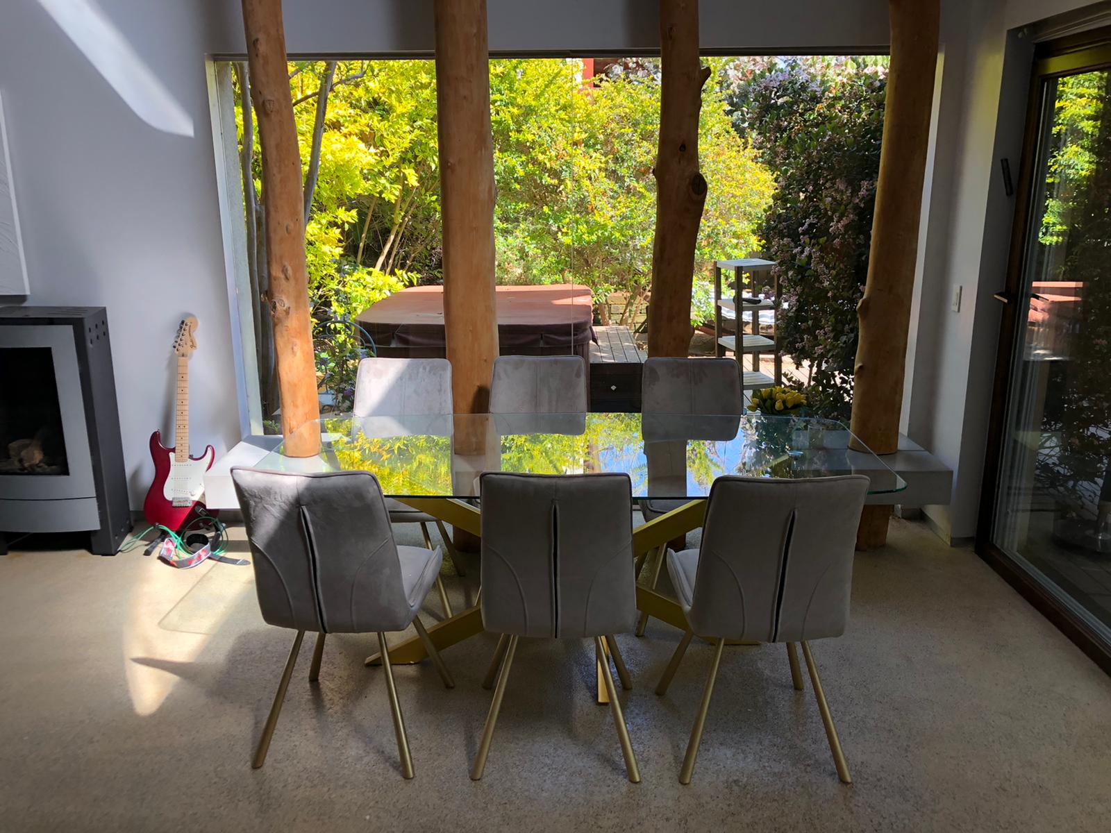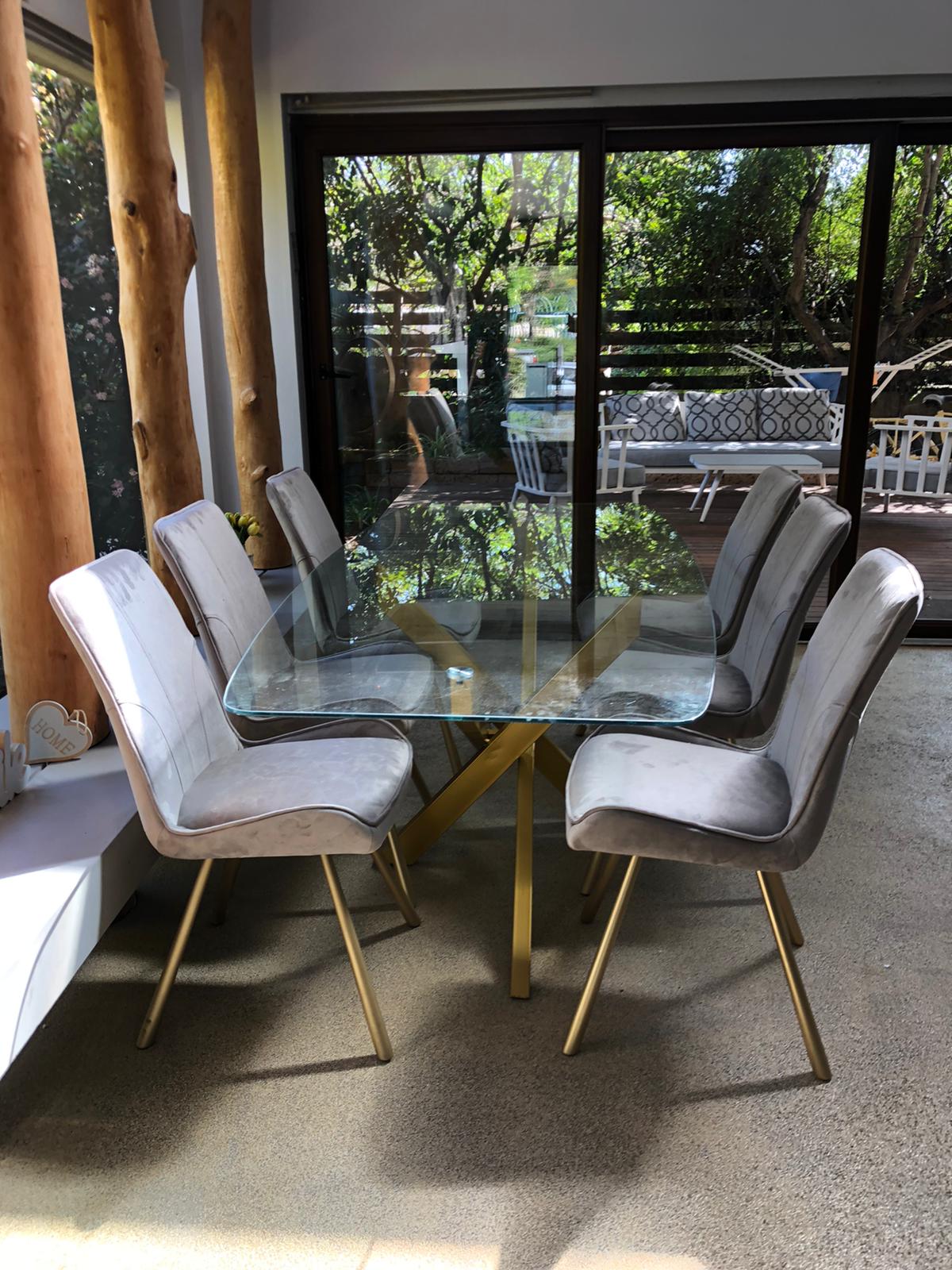 שולחן פלטה זכוכית בלא פינות, רגל מתכת צבע זהב.