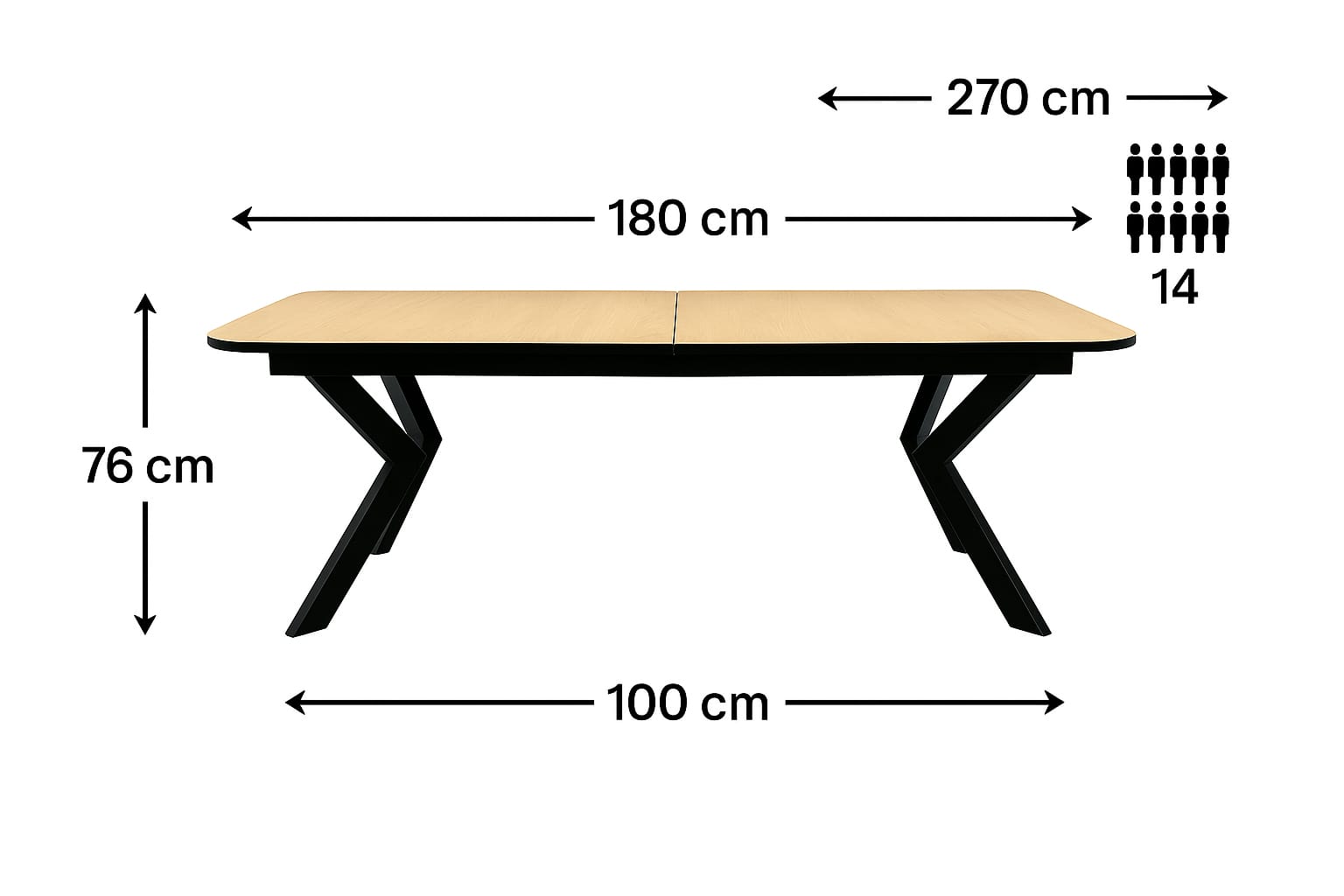 במצב פתוח: עד כ־16 סועדים (לפי רוחב כיסא ממוצע – 45 ס"מ