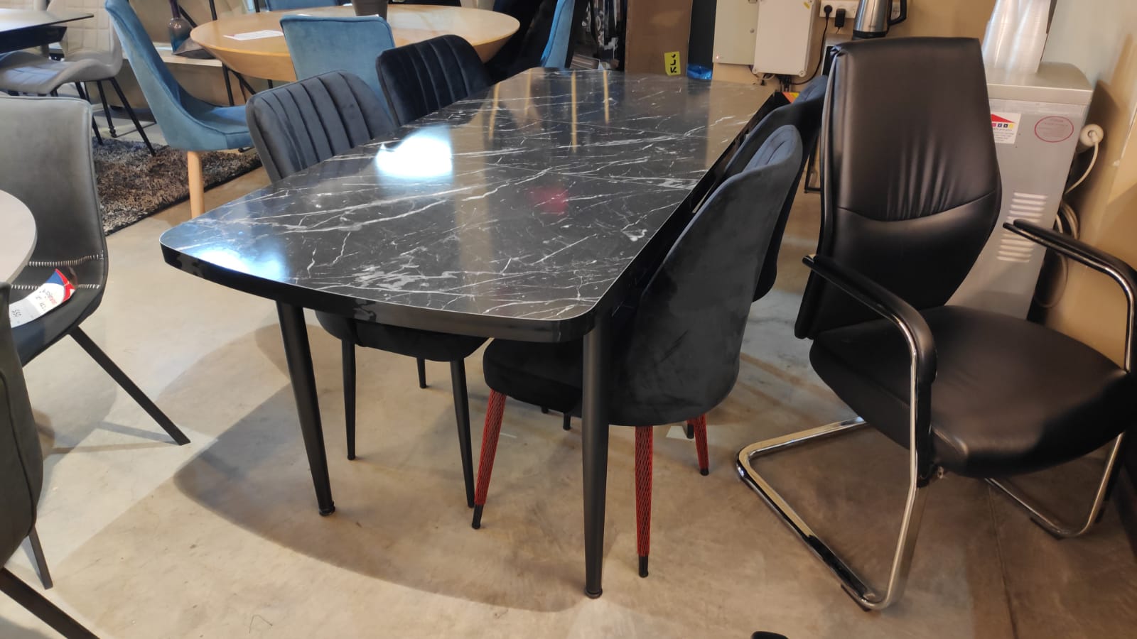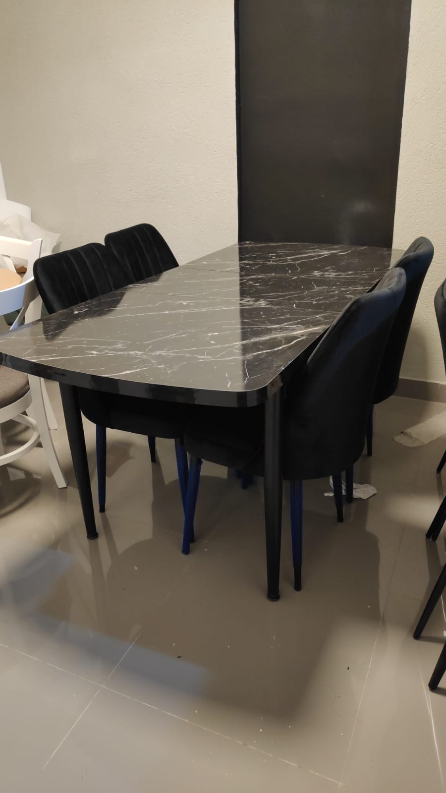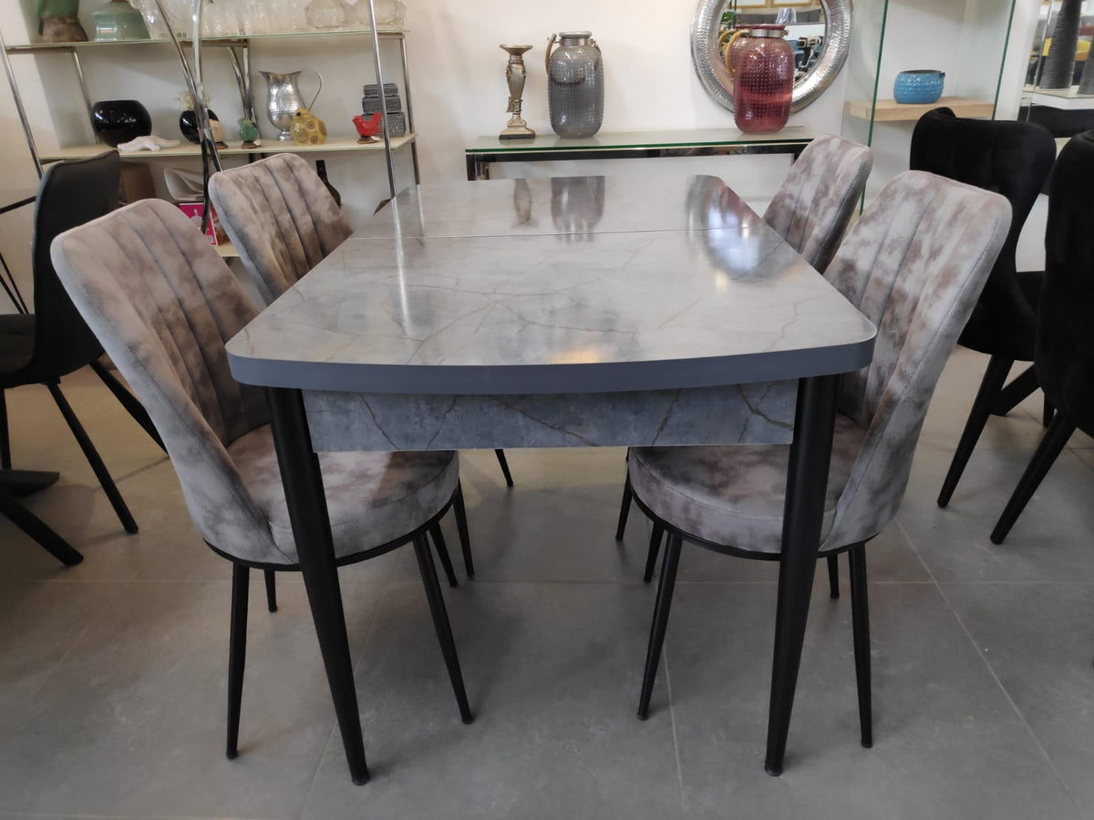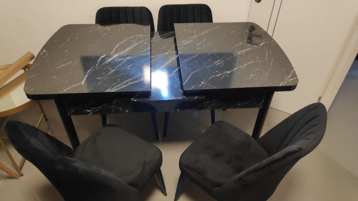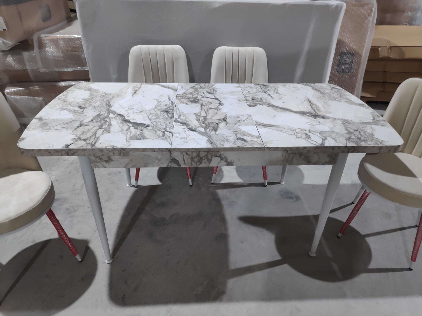 פלתה בציפוי פורמייקה במראה שייש, רגליים ברזל