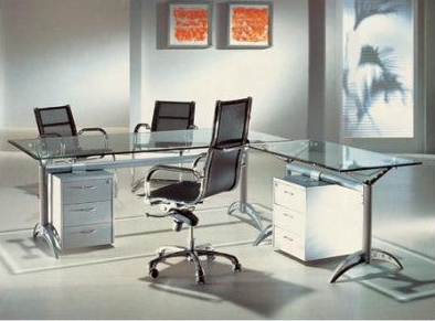 מערכת מנהלים יוקרתית ומפוארת בשילוב פלטה מזכוכית מחוסמת עם רגלי מתכת.