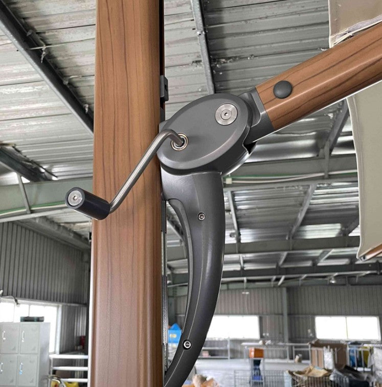 עיצוב חדשי לשמשיה עם צד מוט מאלומיניום בצבע עץ, גודל 4×3 מטר כולל ידית הרמה מעוצבת לפתיחה וסגירה כולל אפשרות לסיבוב של 360 מעלות .